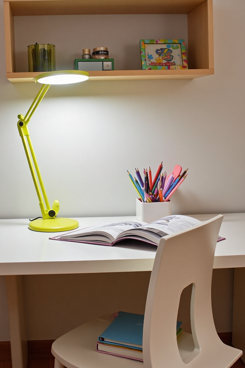 - A modern children’s study area featuring adjustable LED desk lamps and smart lighting, with shelves and school supplies