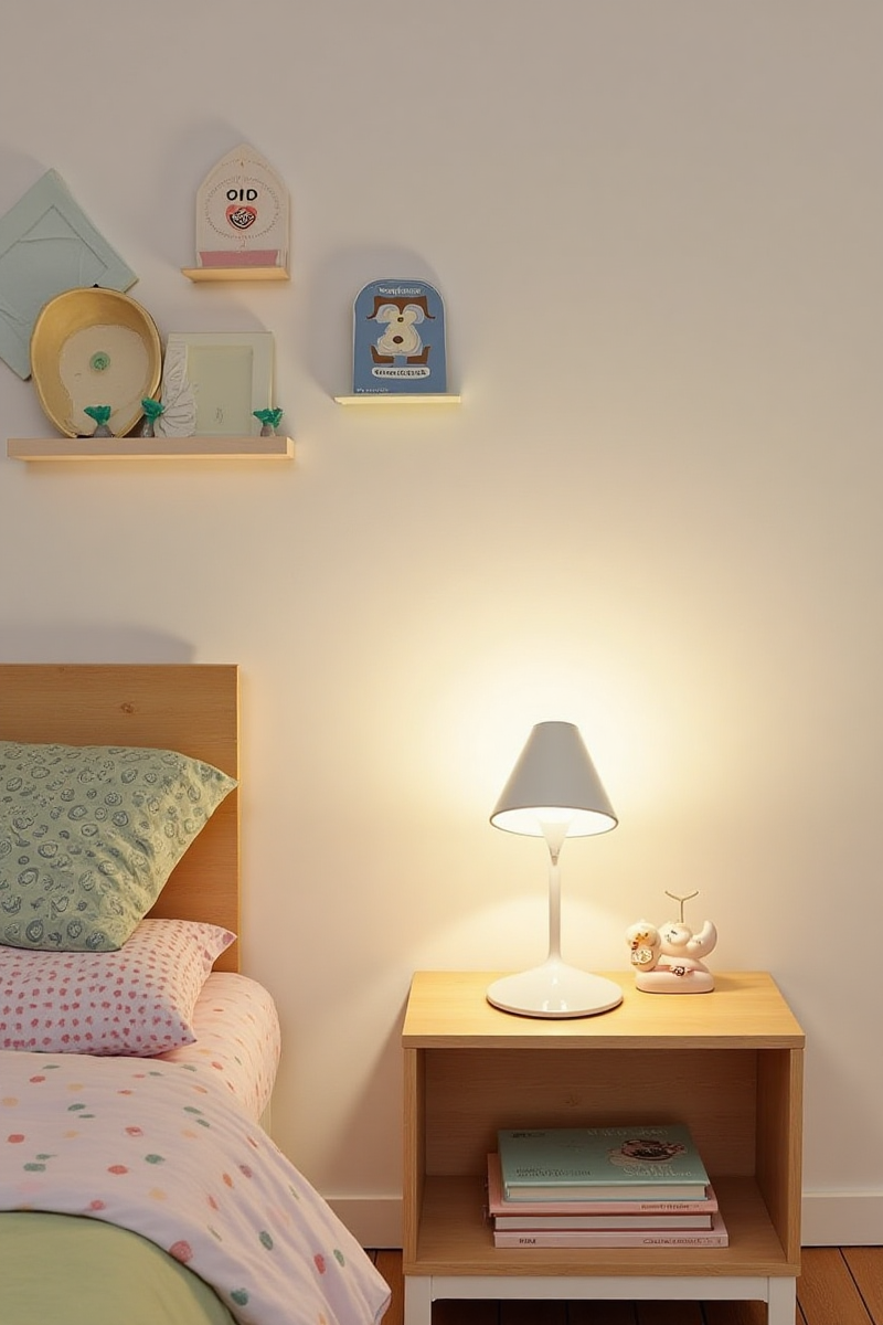 - A kids bedroom with adjustable lighting including a dimmable bedside lamp and a desk lamp, styled with books, toys, and pastel decor