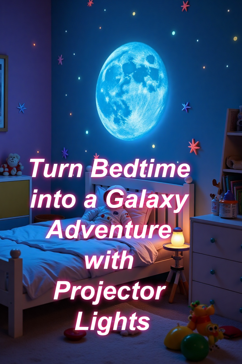 A space-themed kids room featuring a projector lamp with timer and color modes, glowing above a bed surrounded by astronaut toys and moon decals