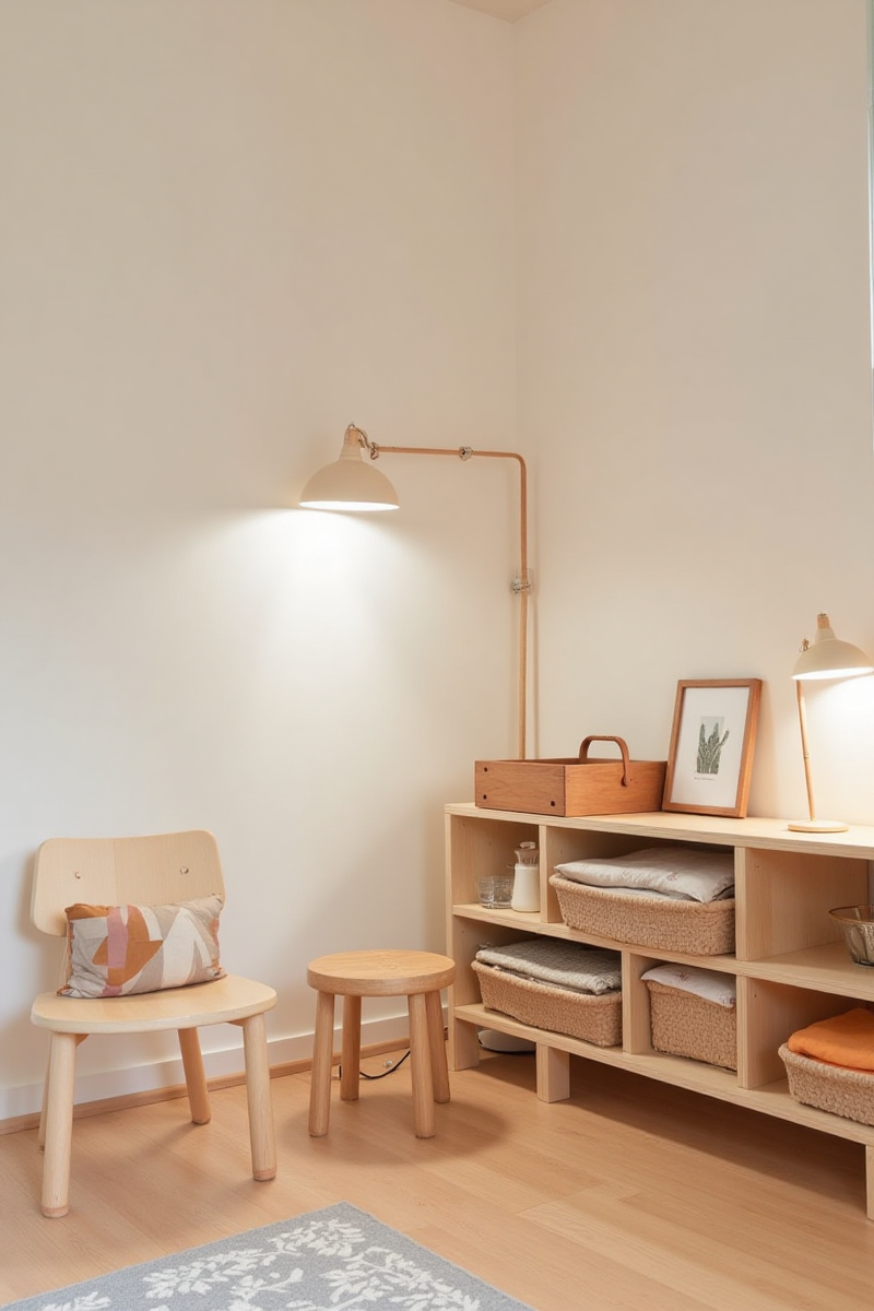 - A Montessori-inspired kids room with low-mounted lamps and natural wood furniture, styled with soft ambient lighting and child-accessible shelves